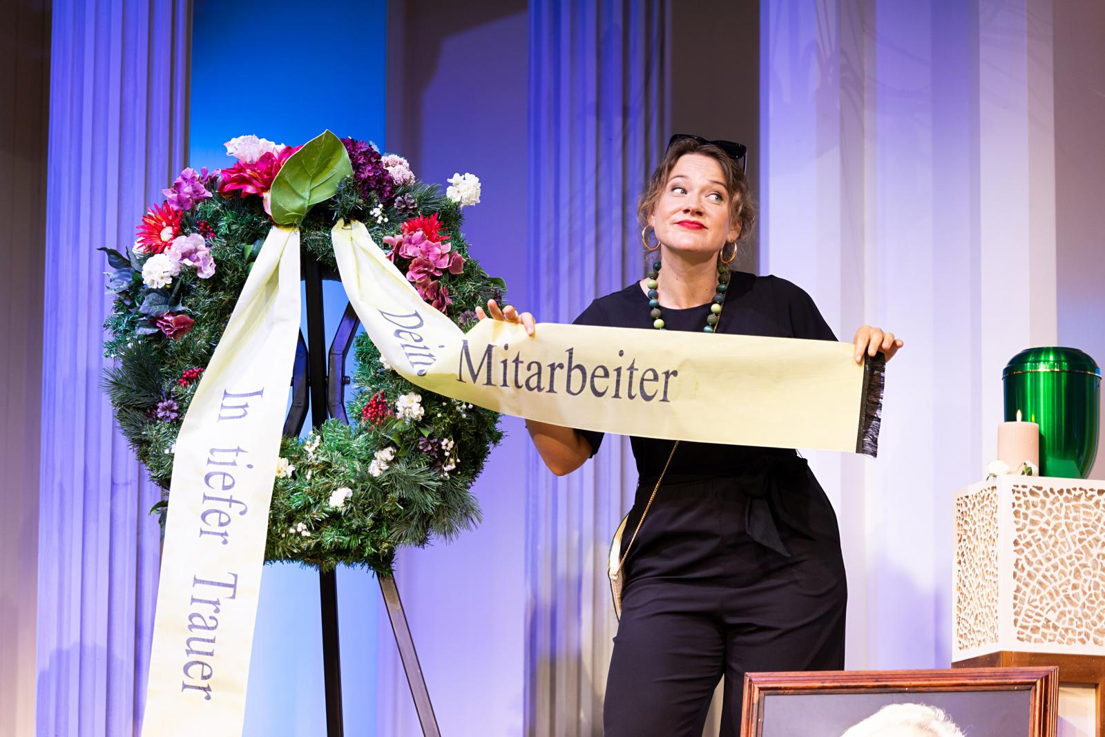 Der neue Geschäftsführer in spe, Horst Bohne, richtet für das Unternehmen die Trauerfeier aus und bestellt unter anderem einen Trauerkranz samt Trauerschleife im Namen aller Angestellten. Horst Bohne weiß nicht, in welche Bredouille ihn diese Schleife bringt, denn der Text darauf lautet: „In tiefer Trauer. Deine Mitarbeiter“.